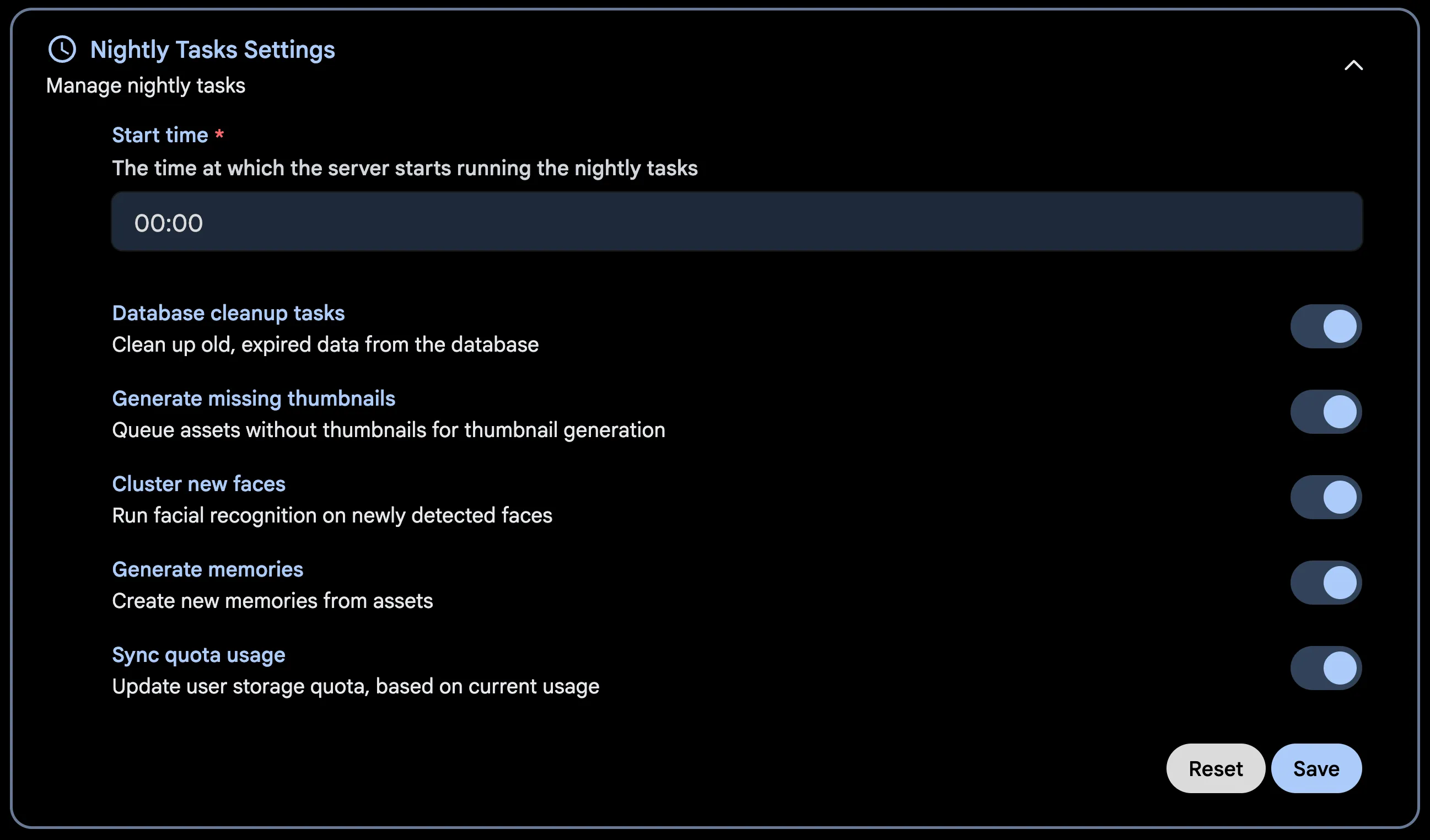 Additionally, some jobs (such as memories generation) run on a schedule, which is every night at midnight by default. To change when they run or enable/disable a job navigate to System Settings -> Nightly Tasks Settings.