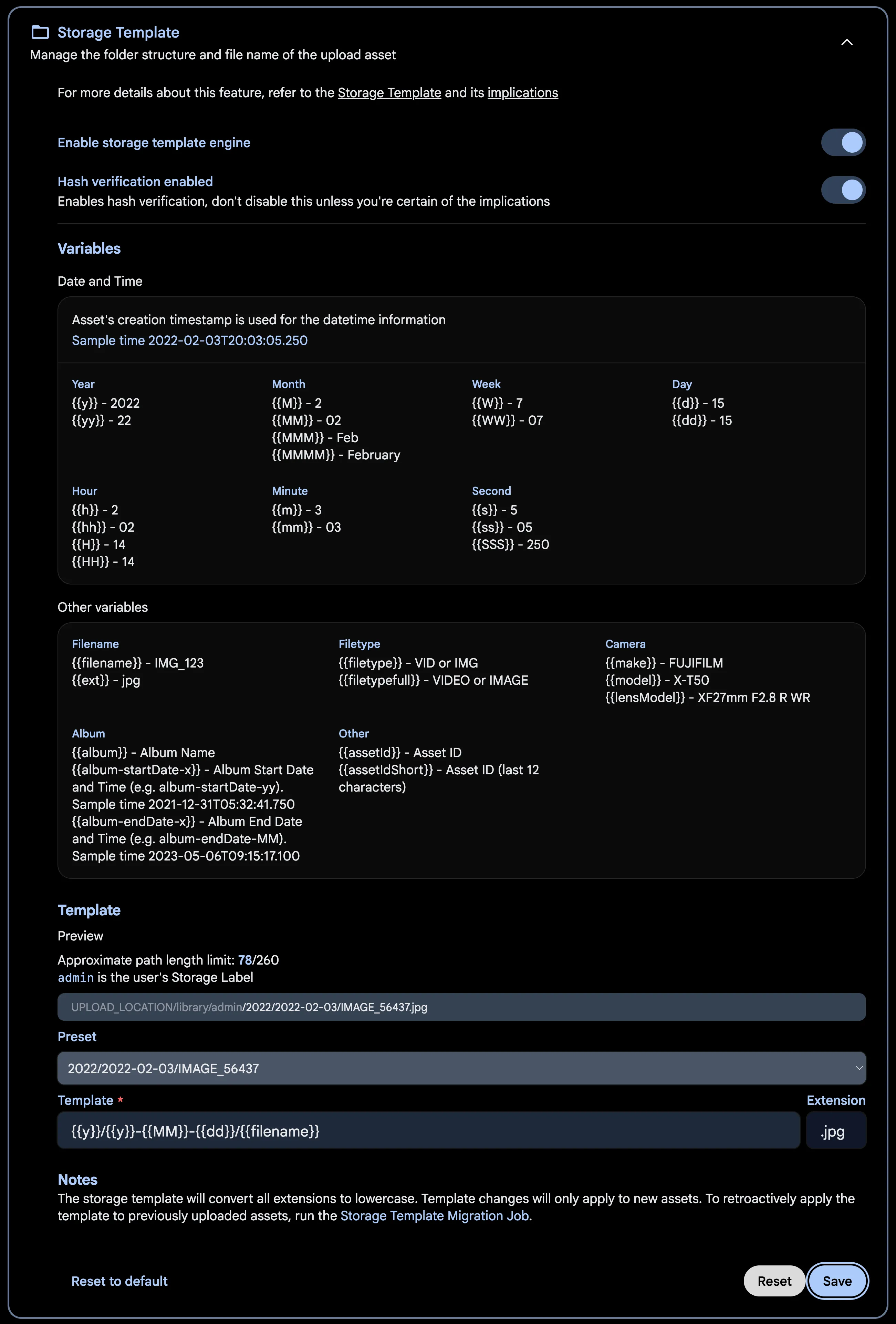 Immich also provides a mechanism to migrate between templates so that if the template you set now doesn't work in the future, you can always migrate all the existing files to the new template. The mechanism is run as a job on the Job page.