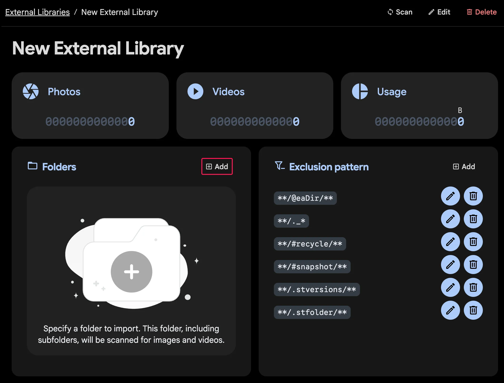 Addin the Folder section to specify a path for scanning and enter /home/user/photos1 as the path and click Add