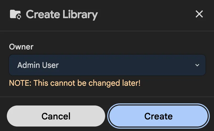 In the dialog, select which user should own the new library